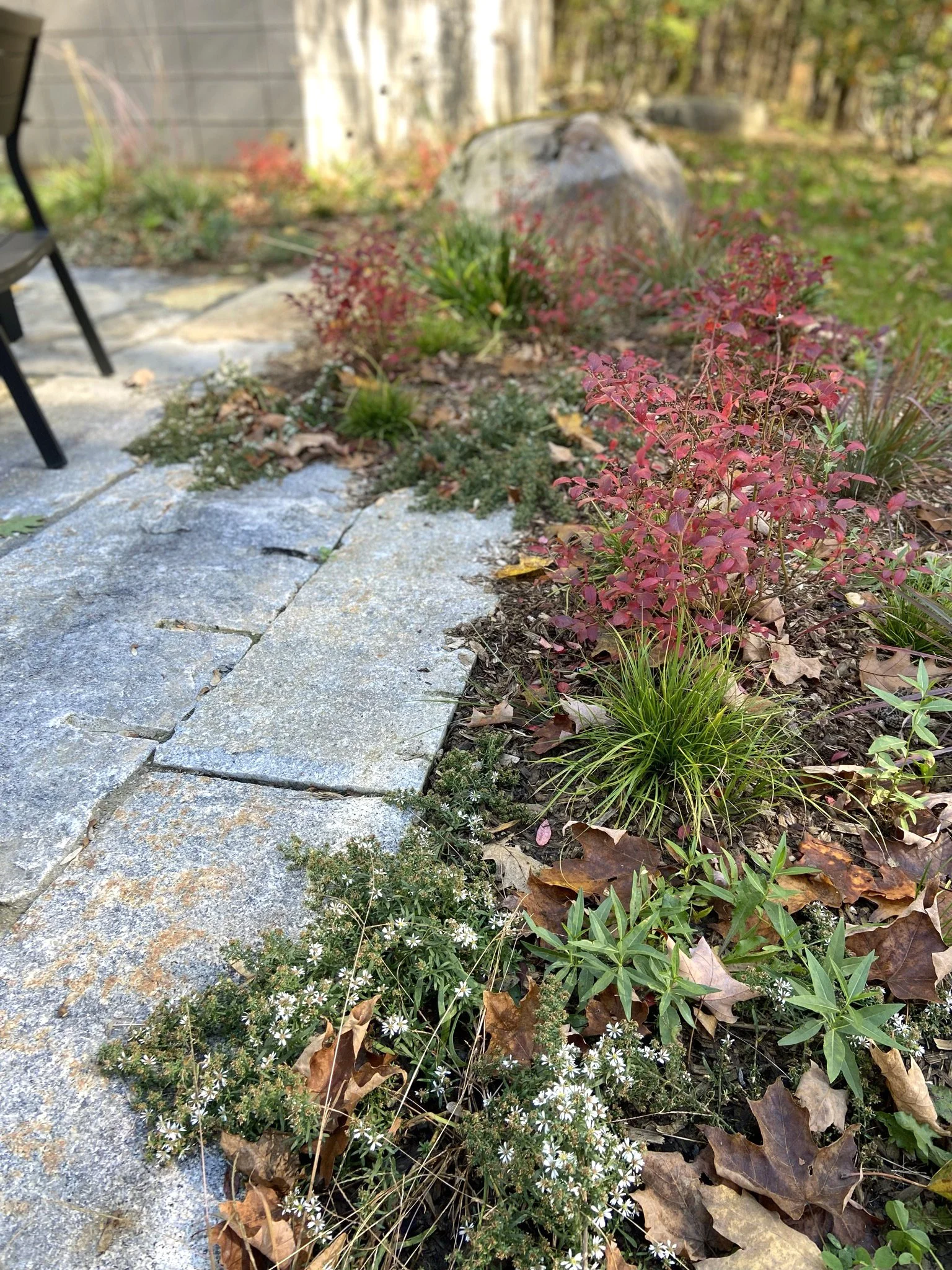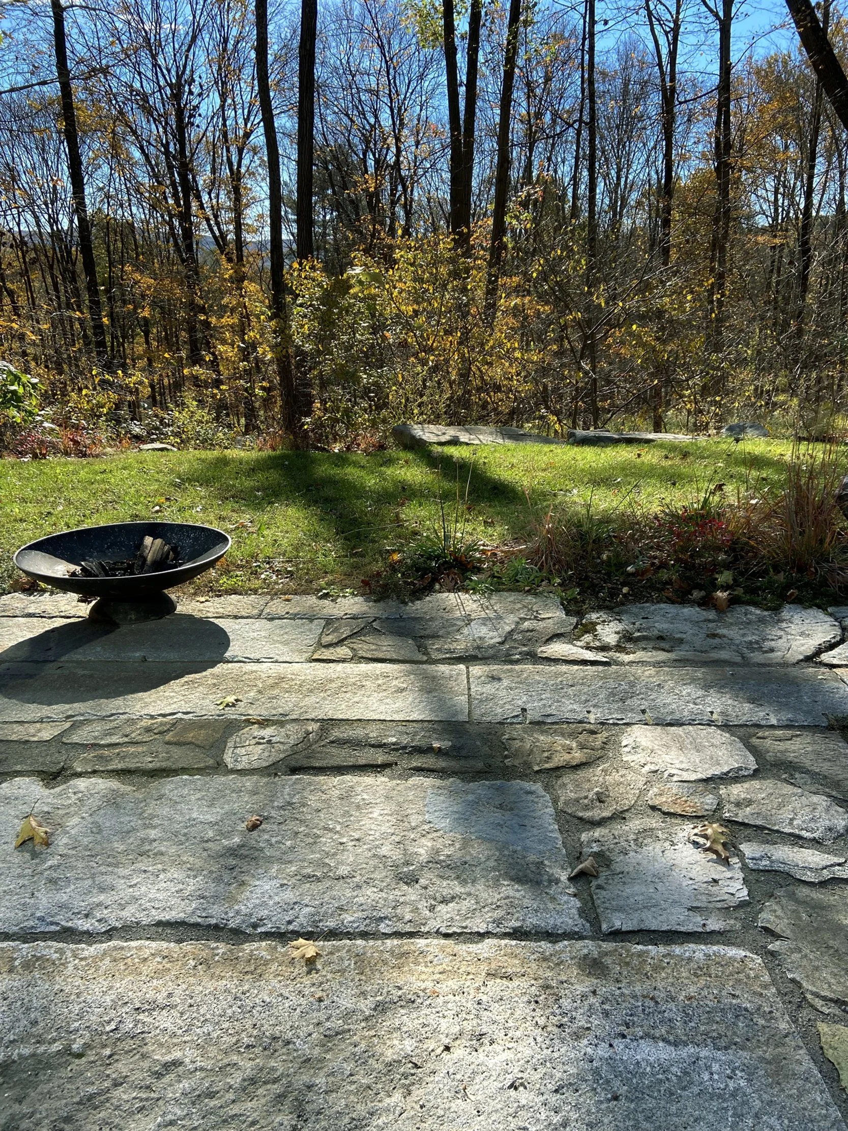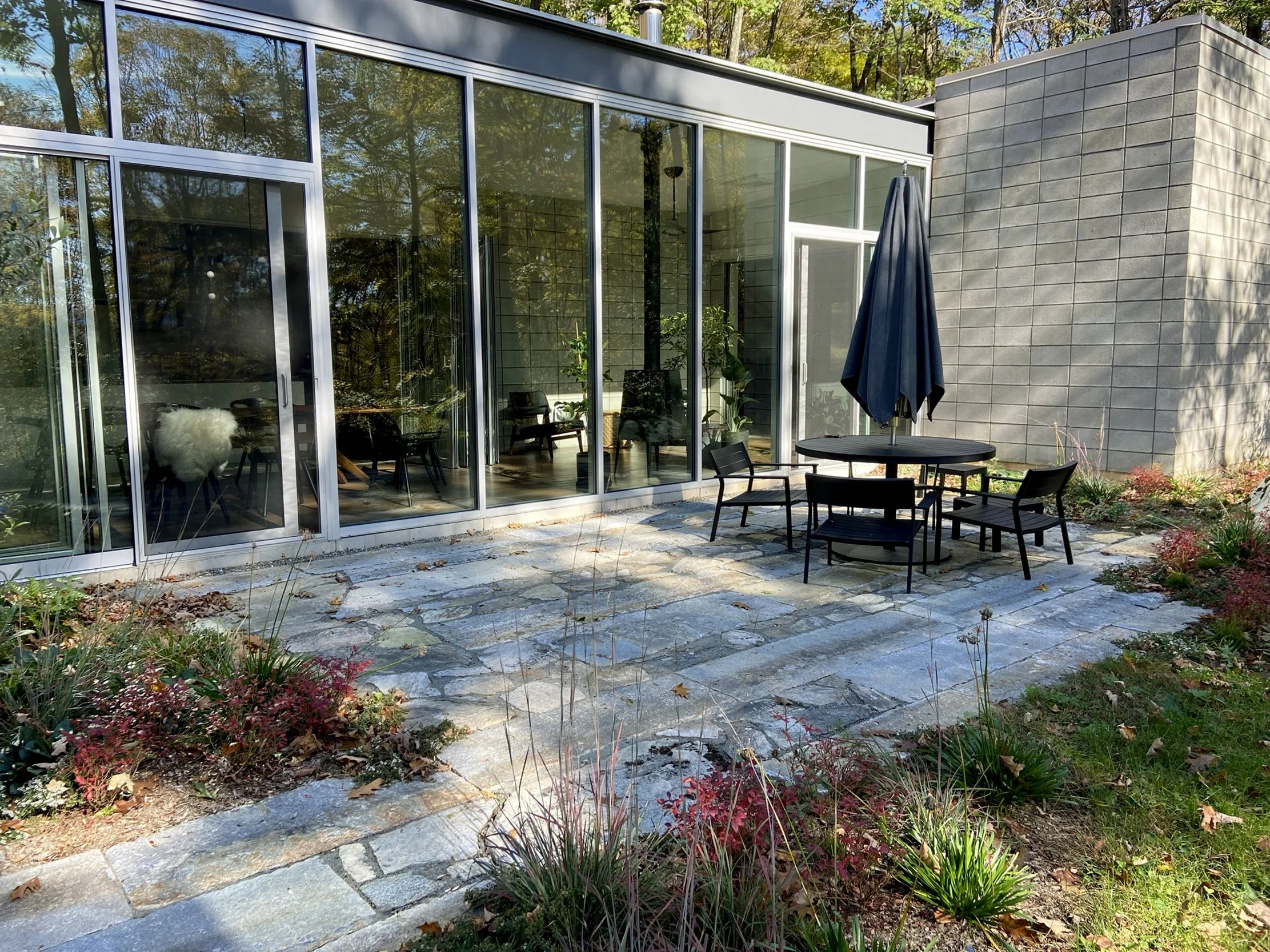 In the south facing patio garden, the new reclaimed granite patio creates a constructed transition from fine architectural finishes to the Hudson Highlands landscape of stone outcrop.