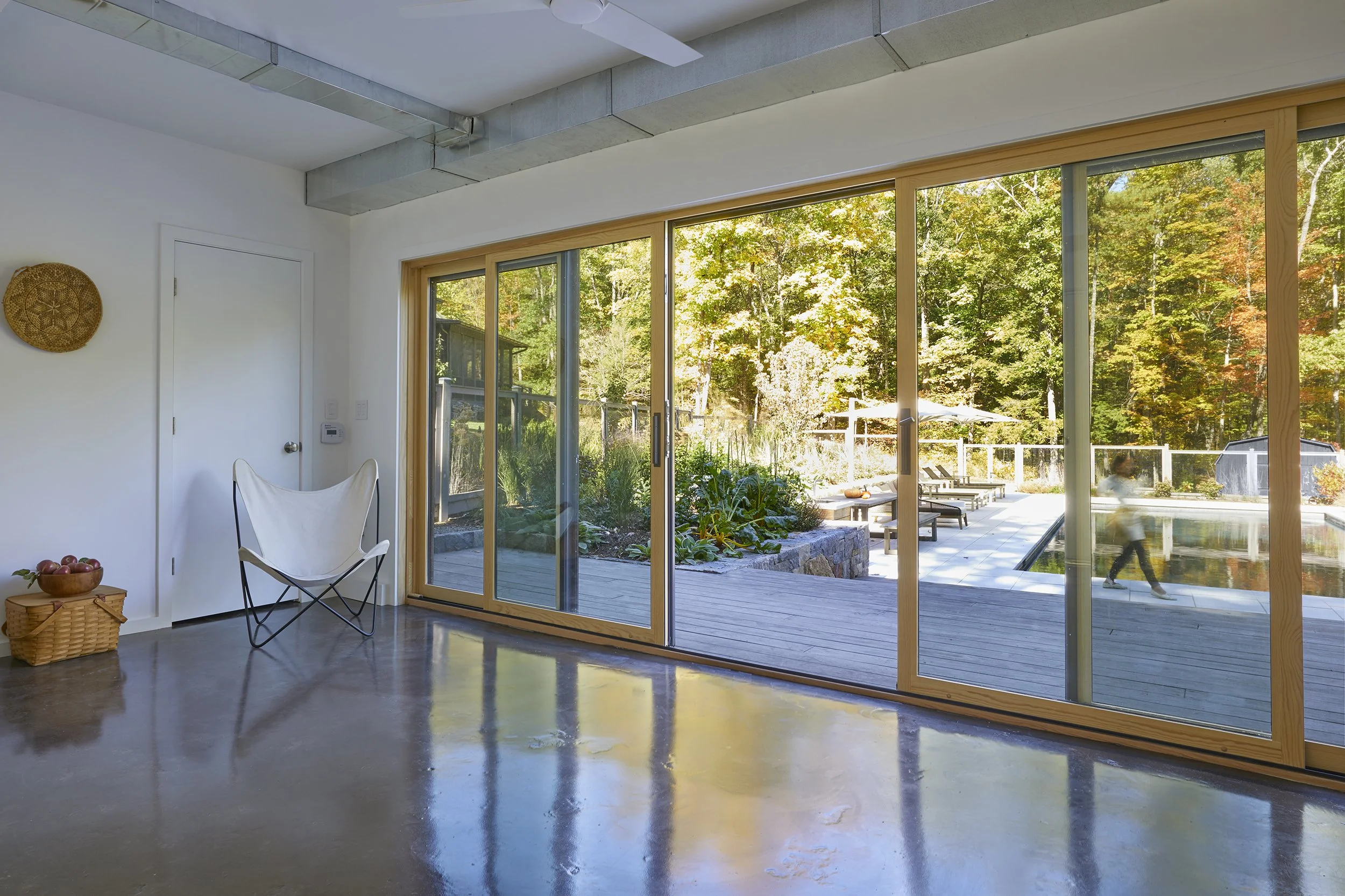 The Pool Room is carved out of the existing garage - architectural design by LE Design. Inside transitions fluidly to outside deck and pool patio with full height sliding doors. A cool retreat from the sunny pool patio during the heat of the day, the room also hosts family movie night, daytime office and workout room.