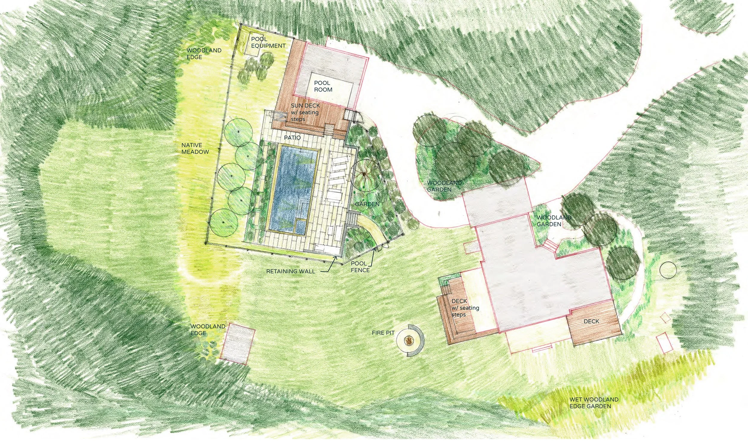 The addition of the pool in the landscape became a balancing act - how to place the pool in a way that would make sense of the existing orientations of the house and garage. The design prioritizes the views within the pool patio and the orthogonal shift is taken up in the deck that transitions from patio to pool room. The deck is constructed from Kebony, a durable, sustainable wood, akin to the performance of tropical hardwoods.