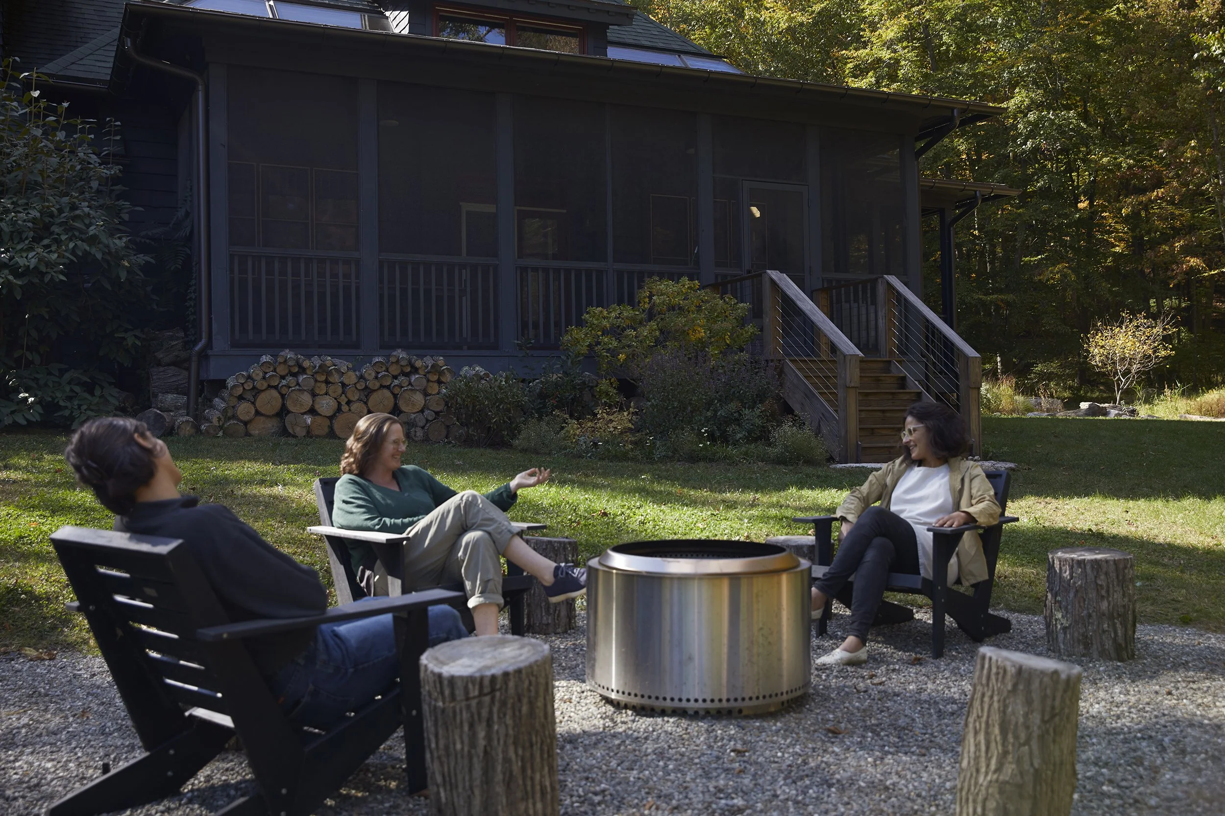 The simple firepit area is enjoyed through the fall and winter seasons.